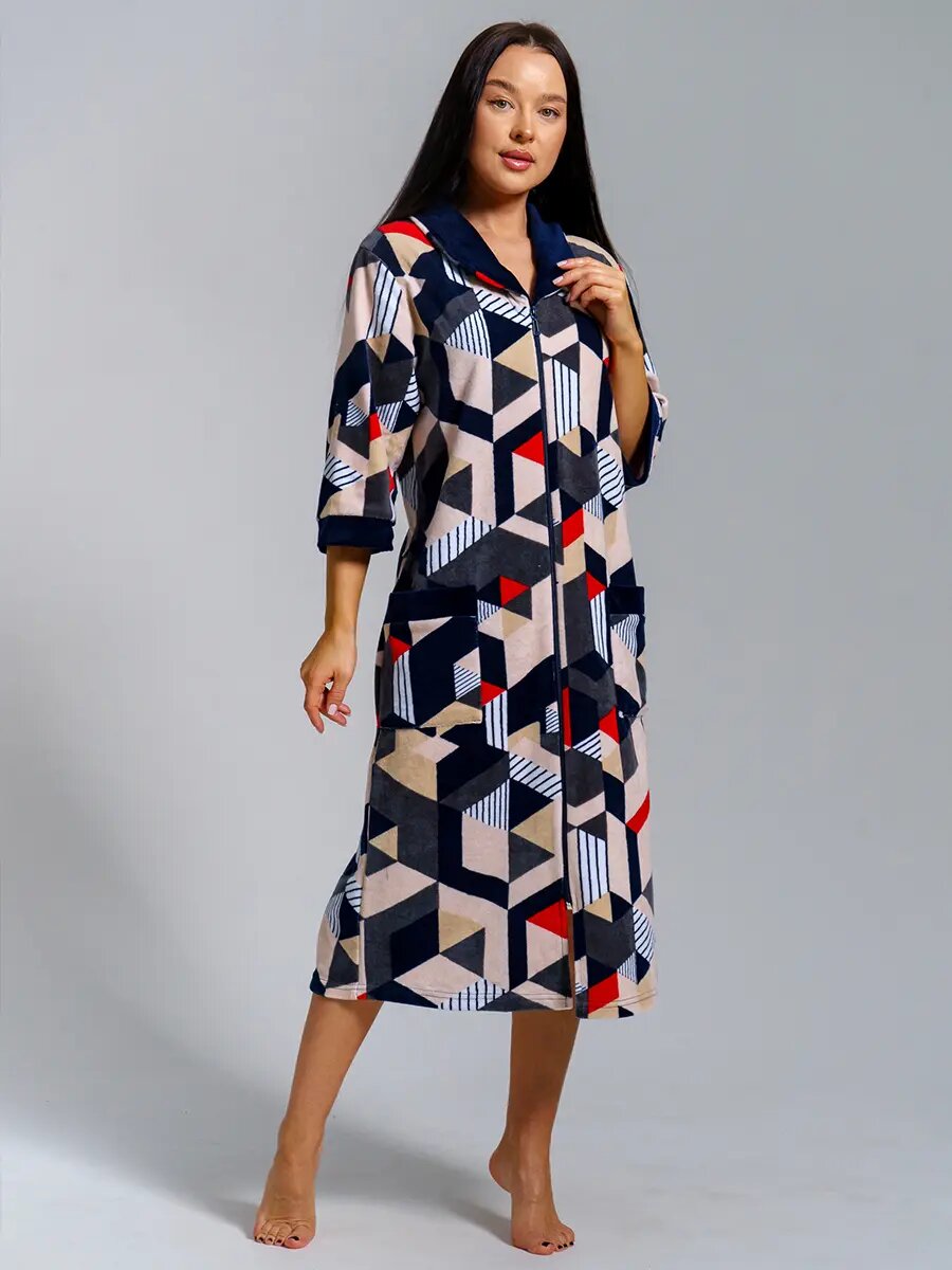 Велюровый женский халат на молнии с отложным воротником. Обтачки карманов, манжеты рукавов и верхний воротник выполнены из отделочной ткани.
