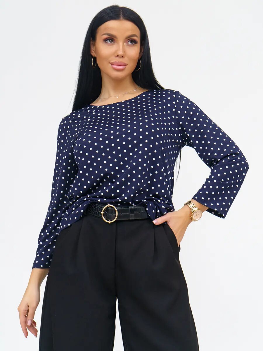 Туника женская с круглым вырезом горловины и рукавом 7/8. Низ туники, горловина, низ рукава обработаны швом вподгибку.