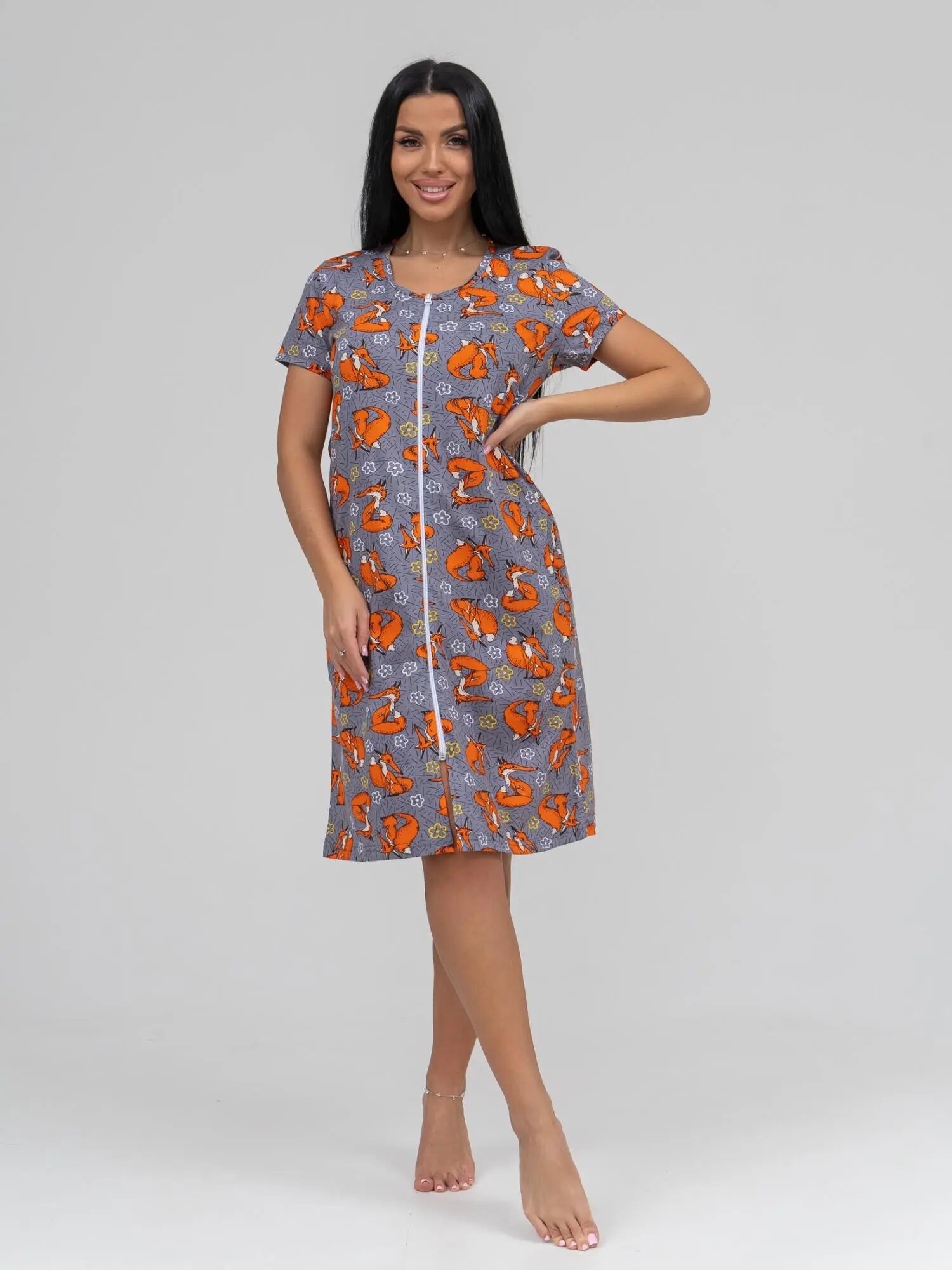 Женский халат на молнии с тематическим принтом, боковыми карманами и коротким рукавом.