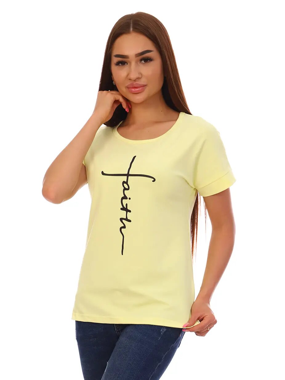 Футболка женская со спущенным плечом, горловина круглой формы, на детали переда печать.