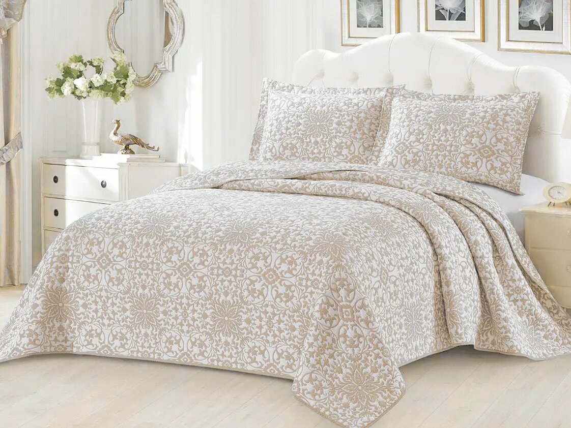 Покрывало двустороннее, что является его несомненным преимуществом. Покрывала Белиссимо эффектны и практичны, они не требуют специального ухода, не мнутся, быстро сохнут. Покрывало хорошо держит форму даже после долгого использования, не тянется и не линяет. Покрывала упакованы в стильные сумки, выполненные в классической бежево-коричневой гамме.