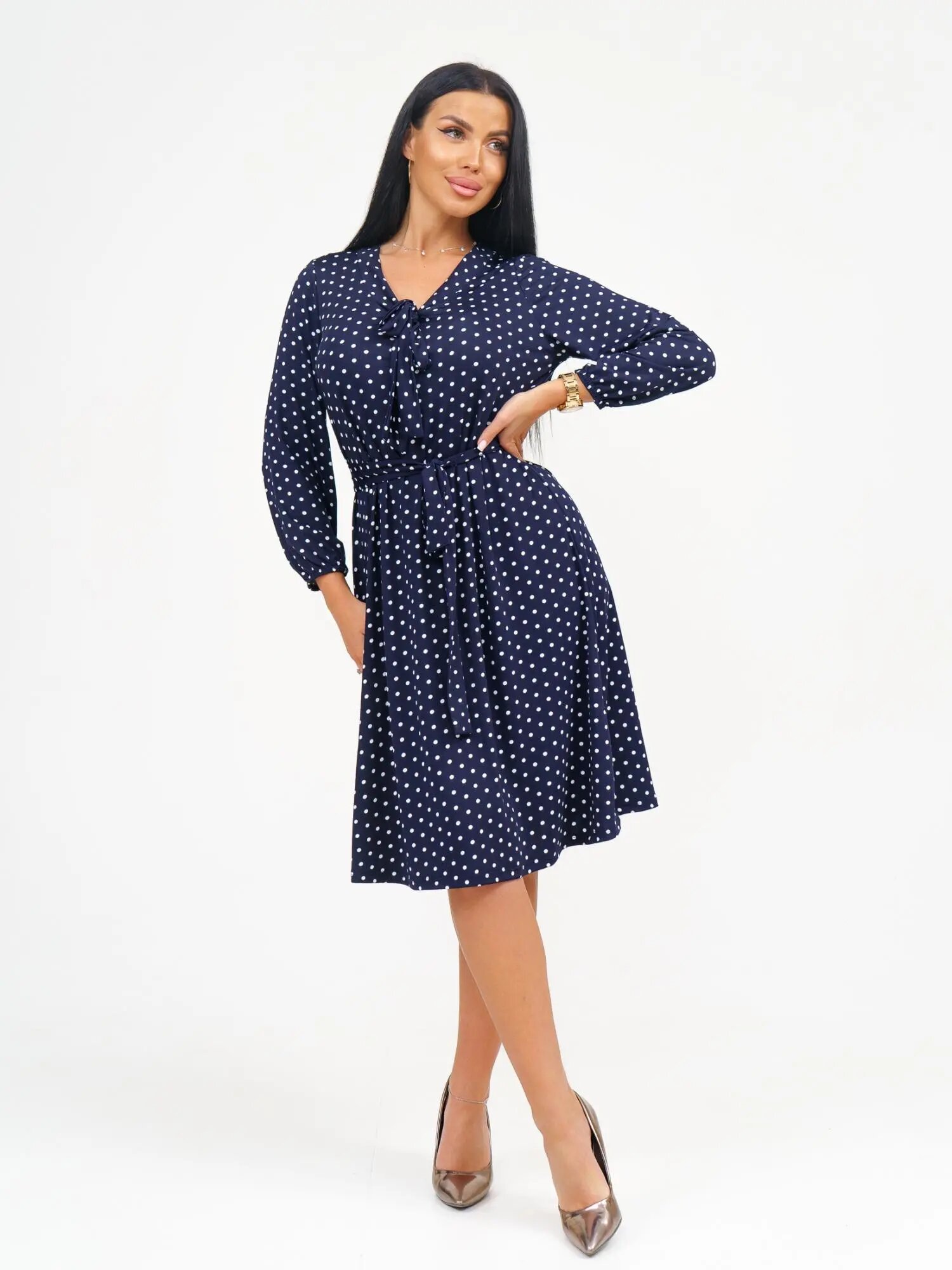 Женское платье с оригинальной горловиной, переходящей в завязки. Рукав на резинке. Пояс.