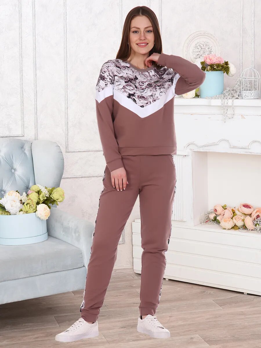 Костюм женский. Куртка с длинным втачным рукавом на манжете, по низу изделия притачной пояс. Брюки на притачном поясе с резинкой, боковым карманом, по низу изделия манжета.