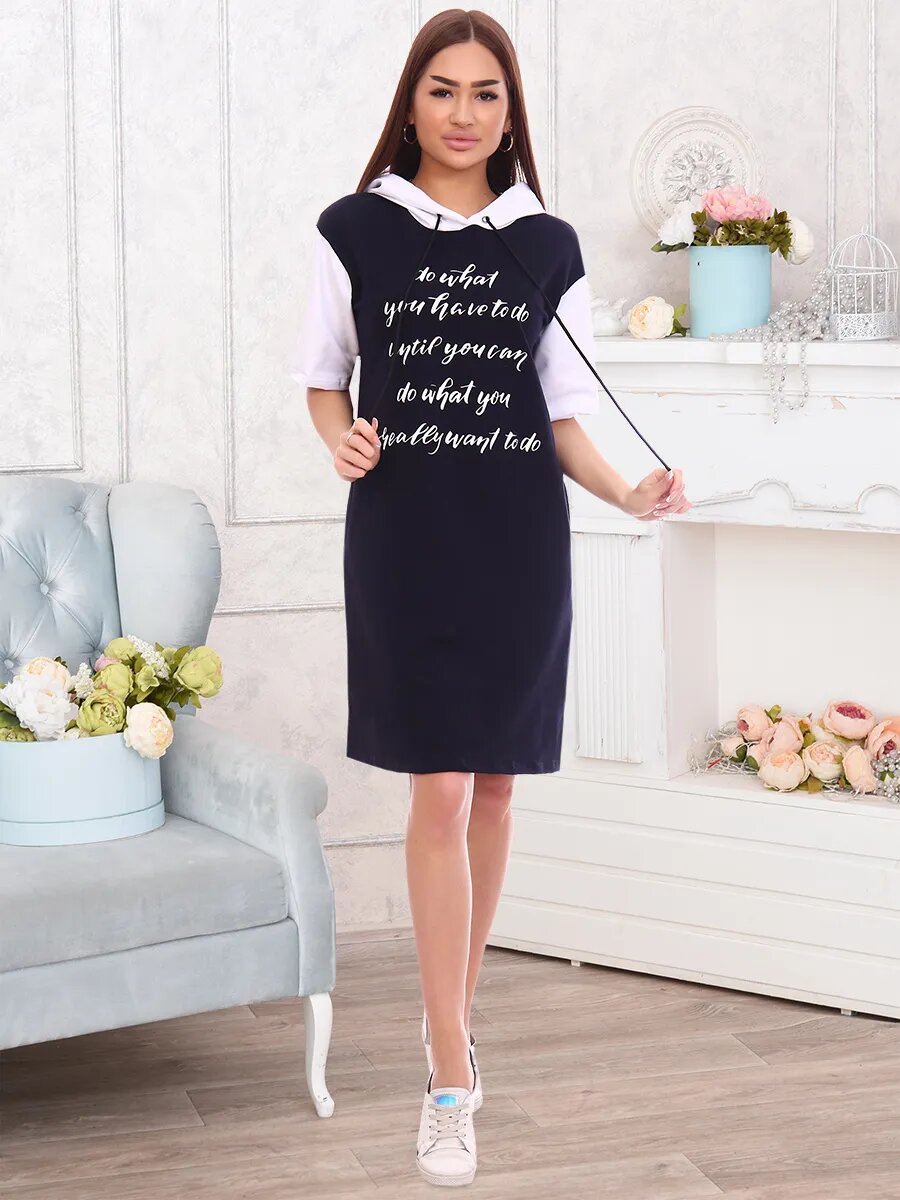 Туника женская со спущенным плечом, капюшоном, втачным рукавом до линии локтя. Капюшон и рукава контрастного цвета. На детали переда боковой карман и печать. В капюшоне декоративный шнур.