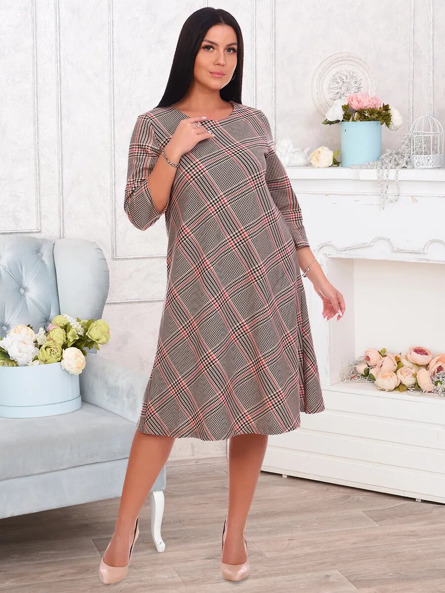Платье А-образного силуэта с рукавом 3/4 и круглой горловиной. Ткань с рисунком клетка.