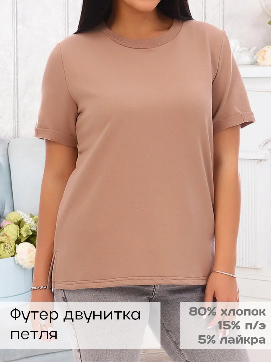 Футболка женская с втачным коротким рукавом. На детали переда фигурная кокетка и застежка на 2 кнопки. На детали спинки — прямая кокетка.