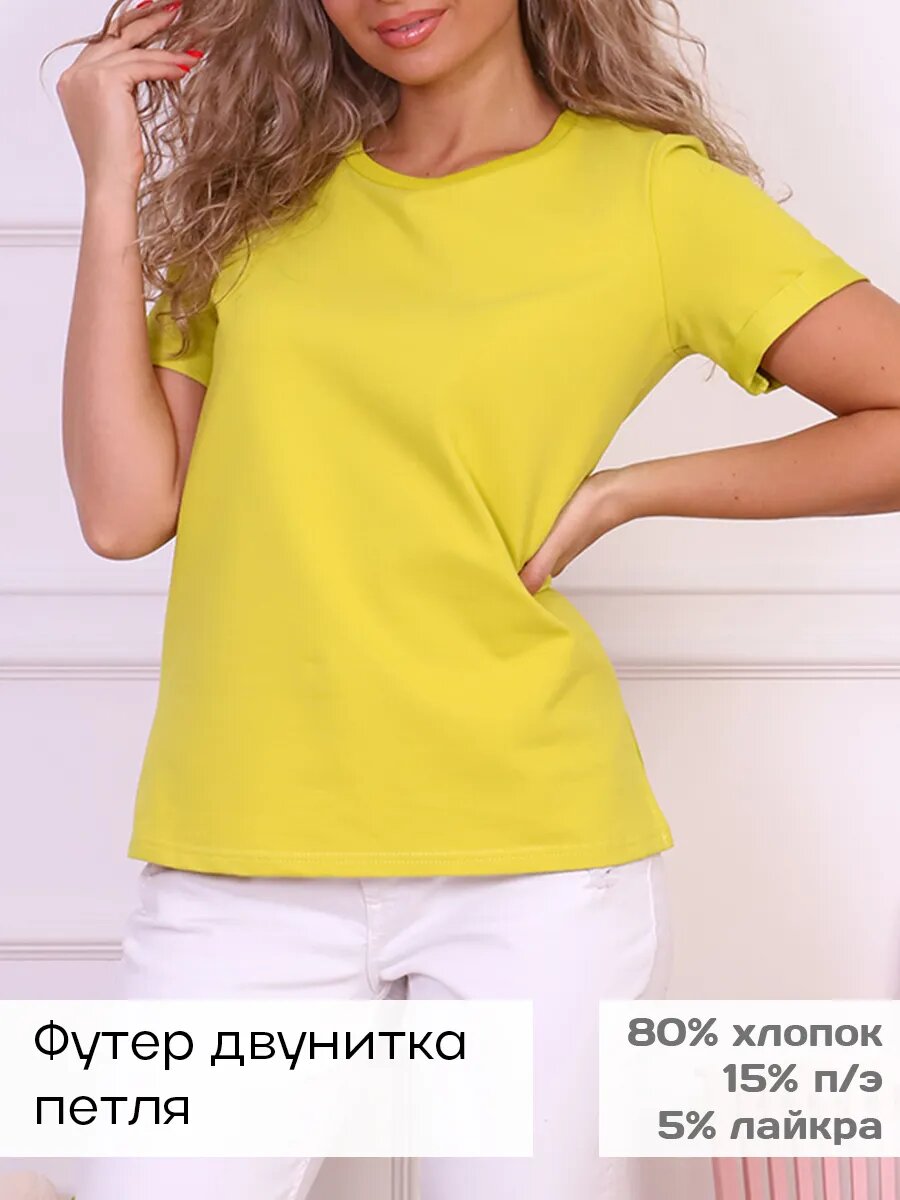 Футболка женская с втачным коротким рукавом. На детали переда фигурная кокетка и застежка на 2 кнопки. На детали спинки — прямая кокетка.