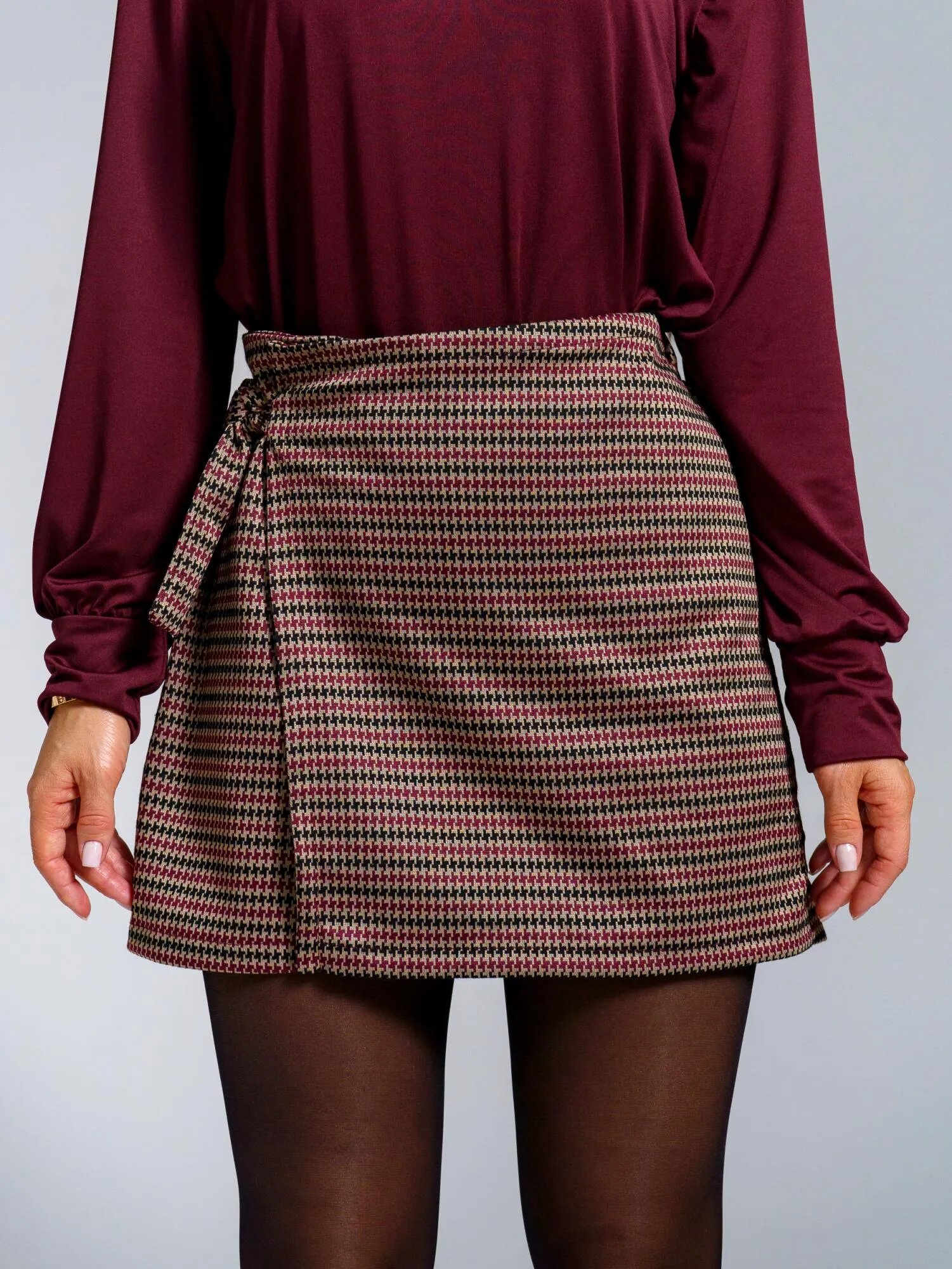 Юбка-шорты женские укороченные из костюмной ткани, спереди декоративный запах, фиксирующийся завязкой. Регулировка талии по спинке резинкой.