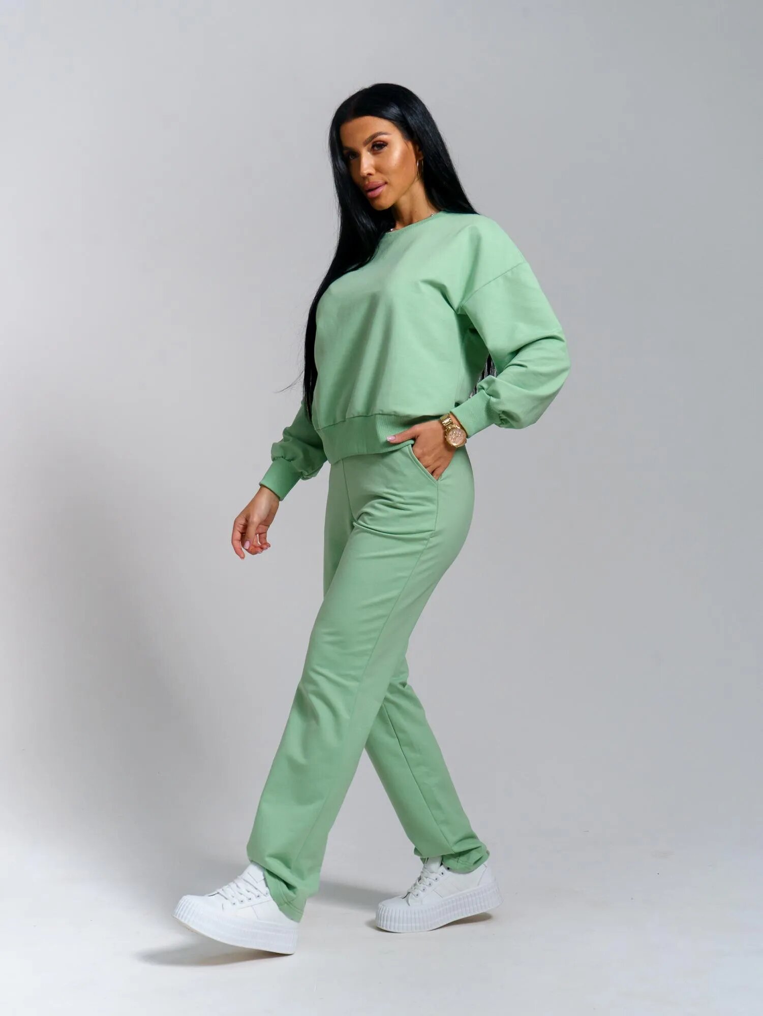 Костюм из гладкокрашенного футера, состоящий из свитшота и брюк прямого кроя. Срезы костюма дополнены кашкорсе в цвет основного полотна. Пояс брюк прошит на поясной машине.