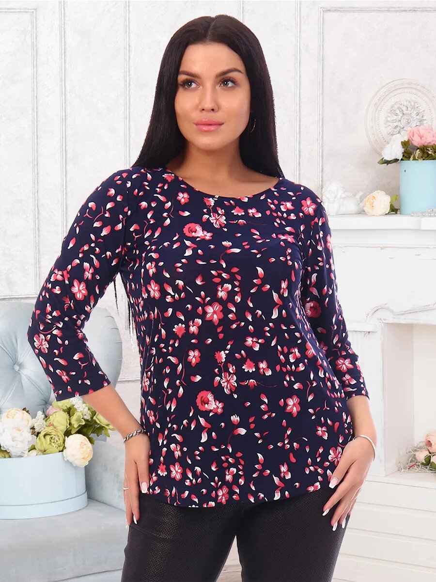 Туника женская с круглым вырезом горловины и рукавом 7/8. Низ туники, горловина, низ рукава обработаны швом вподгибку.