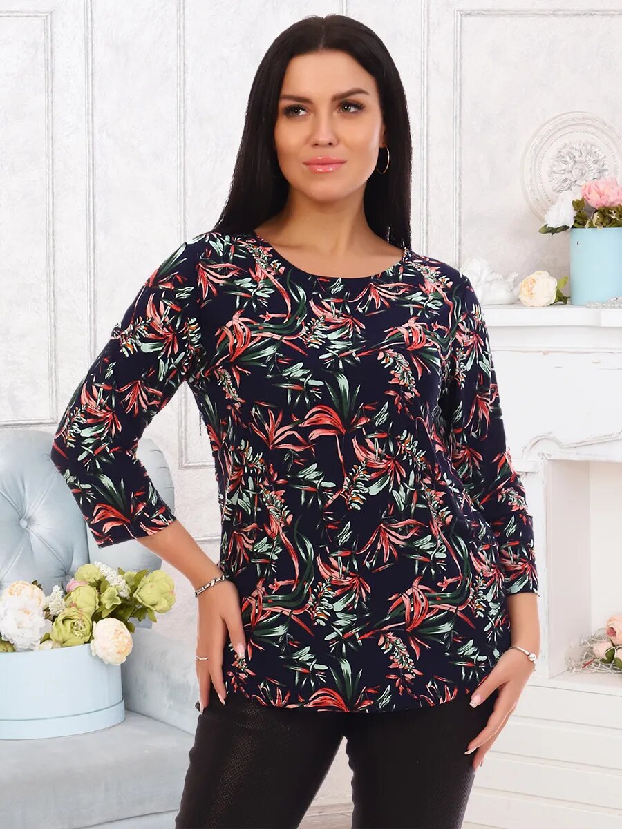 Туника женская с круглым вырезом горловины и рукавом 7/8. Низ туники, горловина, низ рукава обработаны швом вподгибку.