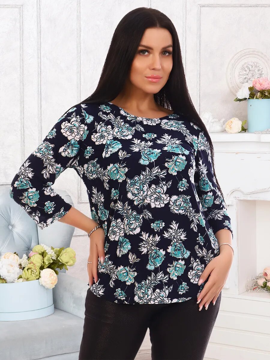 Туника женская с круглым вырезом горловины и рукавом 7/8. Низ туники, горловина, низ рукава обработаны швом вподгибку.