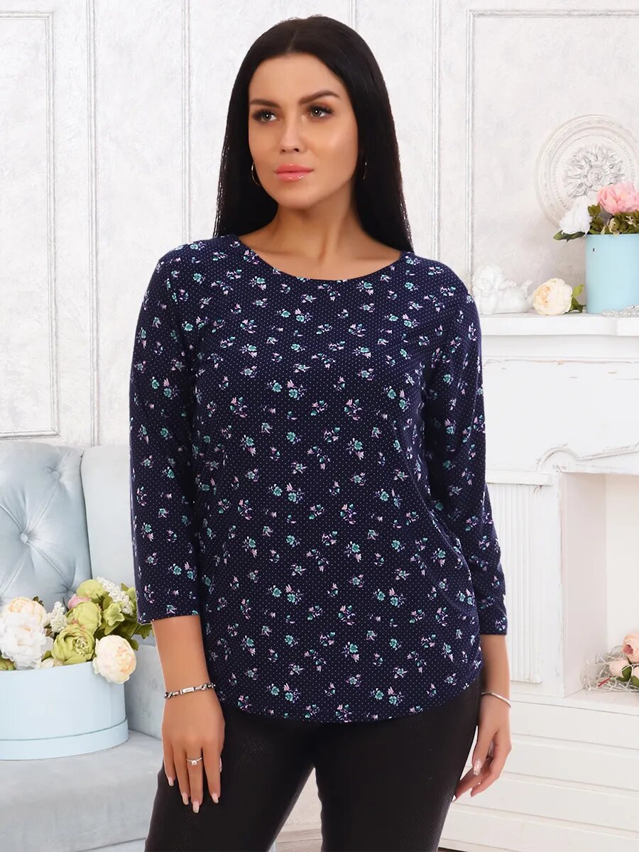 Туника женская с круглым вырезом горловины и рукавом 7/8. Низ туники, горловина, низ рукава обработаны швом вподгибку.