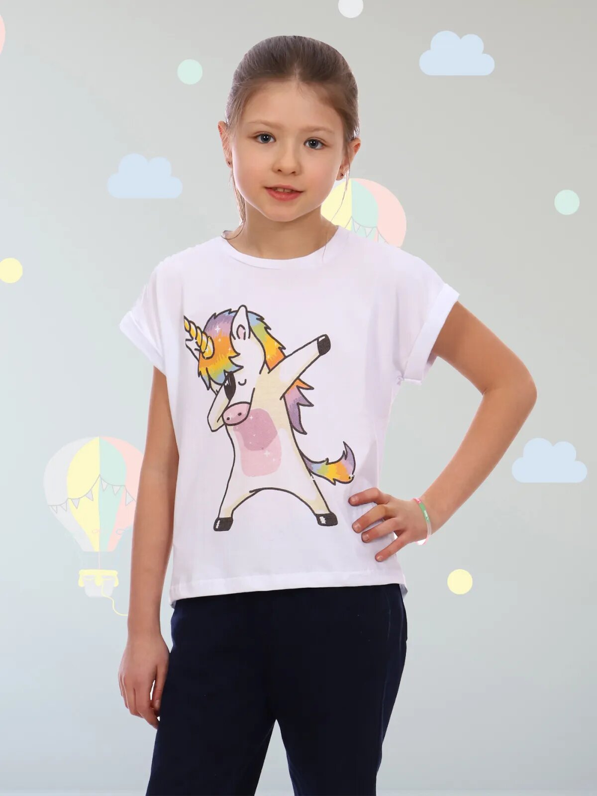Футболка детская со спущенным плечом. Низ изделия фигурной формы. На детали переда печать.