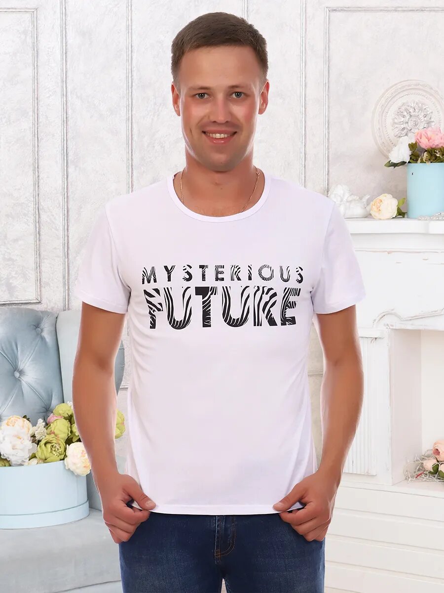 Мужская футболка свободного кроя из хлопчатобумажного полотна с коротким рукавом. На полочке выполнен оригинальный принт. Горловина футболки окантована, низ рукавов и футболки подшиты на плоскошовной машине