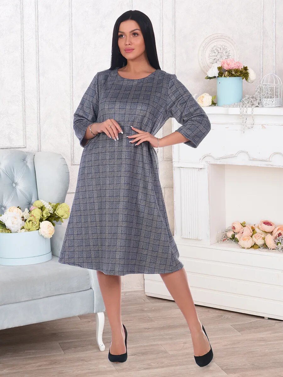 Платье А-образного силуэта с рукавом 3/4 и круглой горловиной. Ткань с рисунком клетка.