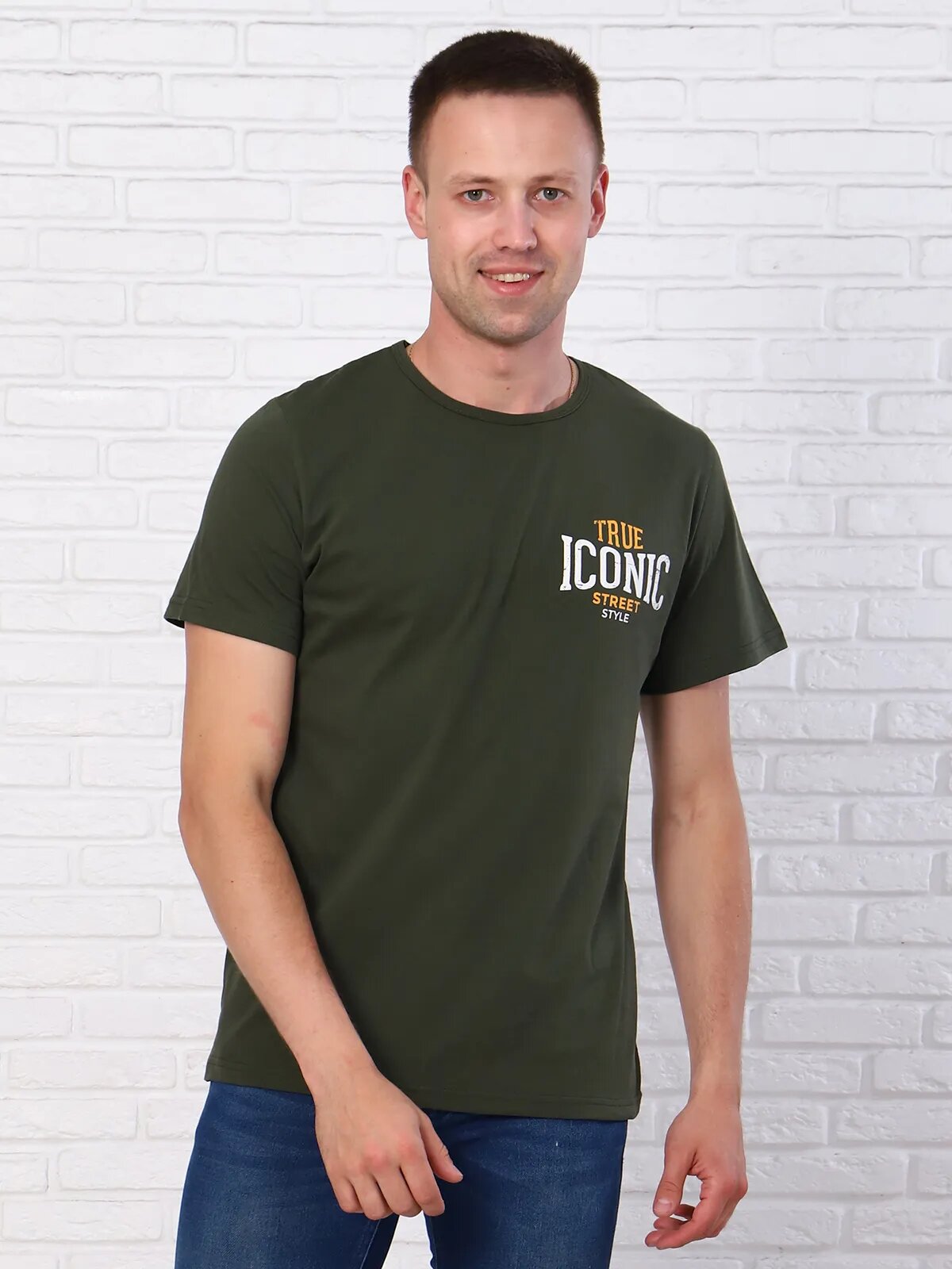Мужская футболка свободного кроя из хлопчатобумажного полотна с коротким рукавом. На полочке выполнен оригинальный принт. Горловина футболки окантована, низ рукавов и футболки подшиты на плоскошовной машине.