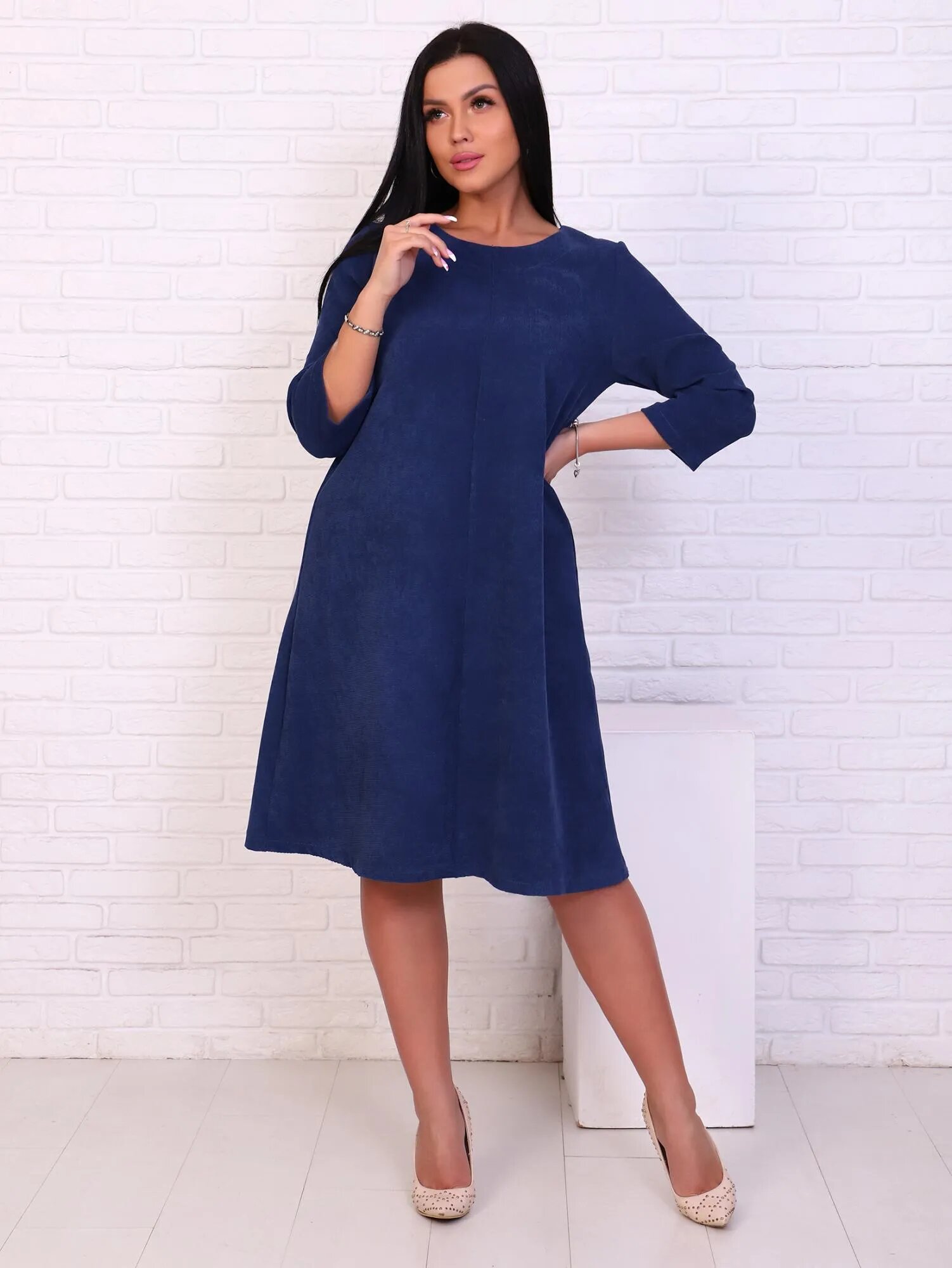 Женственное платье из фактурной ткани с рукавом ниже локтя и расклешеным низом.