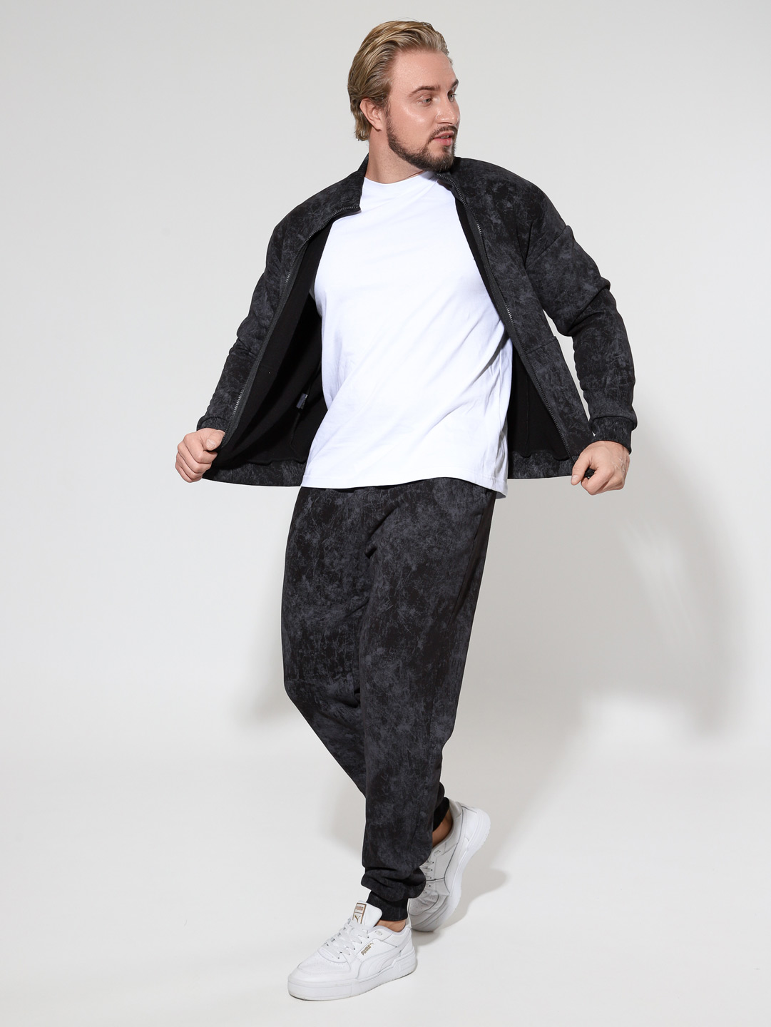 Утепленный мужской костюм из футера с начесом, с крашением варенка. Толстовка с высоким горлом на молнии, карманом кенгуру и манжетами из кашкорсе по низу рукавов и кофты. Брюки джоггеры с карманами в боковых швах, поясом на резинке с несколькими отстрочками и манжетами из кашкорсе по низу брюк.