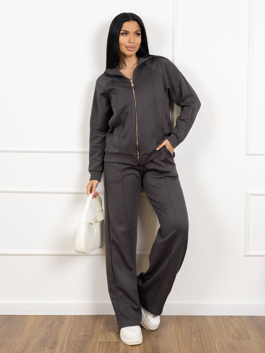 Женский костюм с брюками палаццо из фактурной ткани. Толстовка на молнии с рельефами, декоративной отстрочкой, карманами в рельефах и рукавом реглан. Брюки со стрелками, на поясе с несколькими отстрочками и карманами в боковых швах.