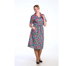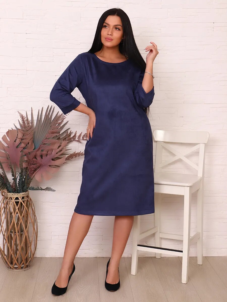 Платье прямого силуэта из замшевой ткани с рукавом ниже локтя. Горловина и низ платья подшиты плоскошовным швом.