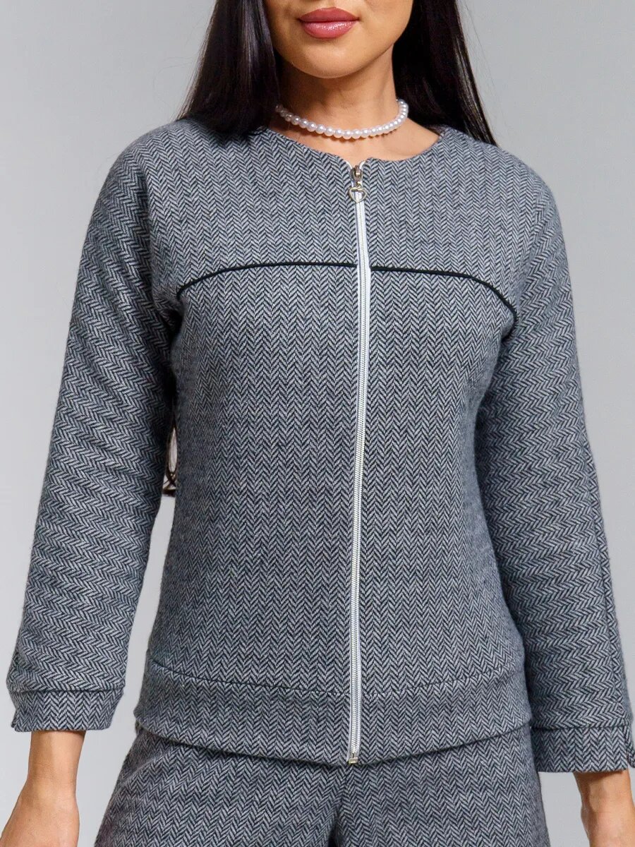 Жакет женский облегающего покроя на молнии. Рукав с декоративным манжетом длиной 7/8. Горловина обработана обтачкой, по низу жакета пояс. В кокетку переда вставлен декоративный кант.