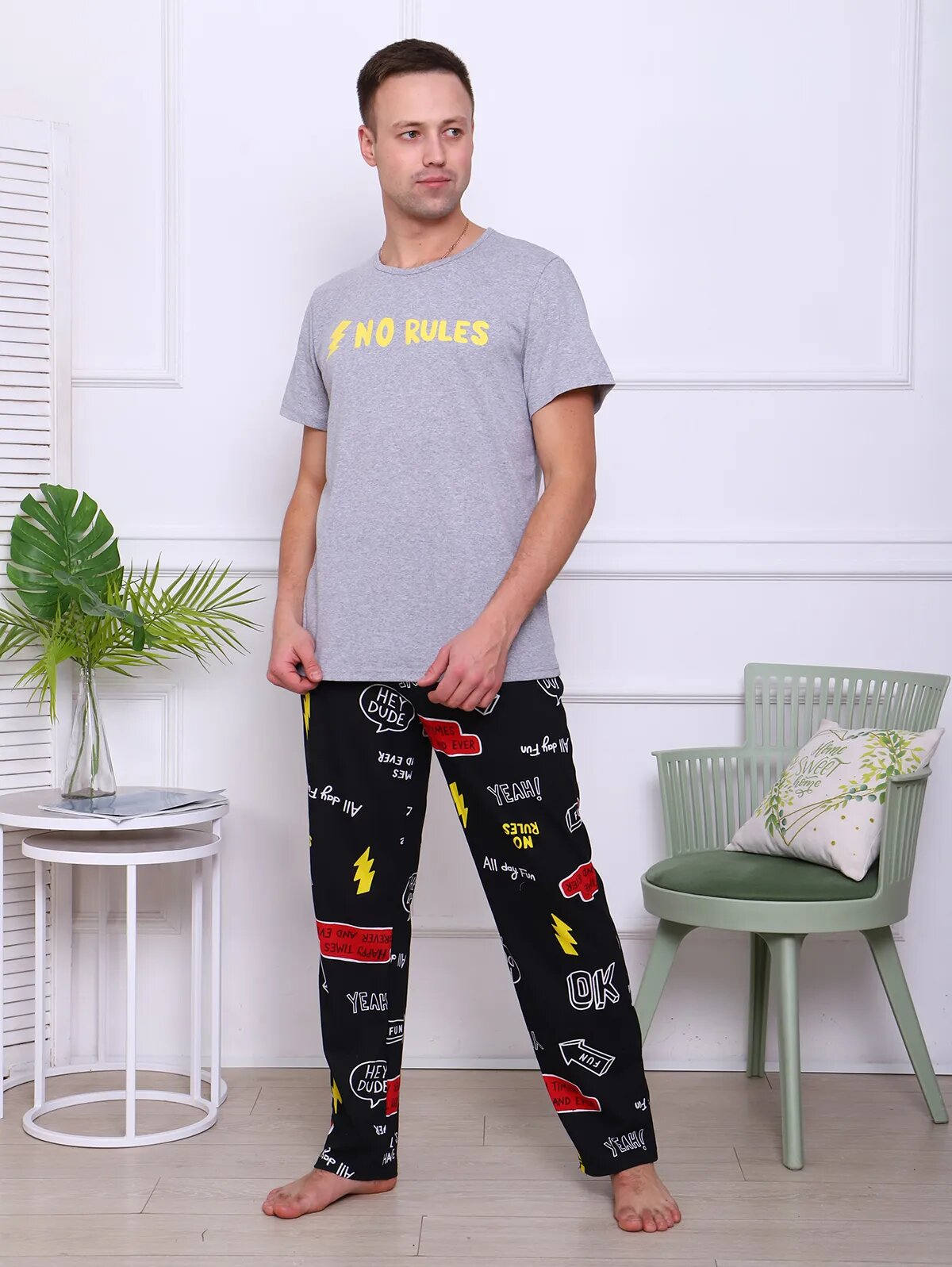 Комплект мужской из набивных брюк и гладкой футболки. Брюки с карманами на поясе, футболка с коротким рукавом.