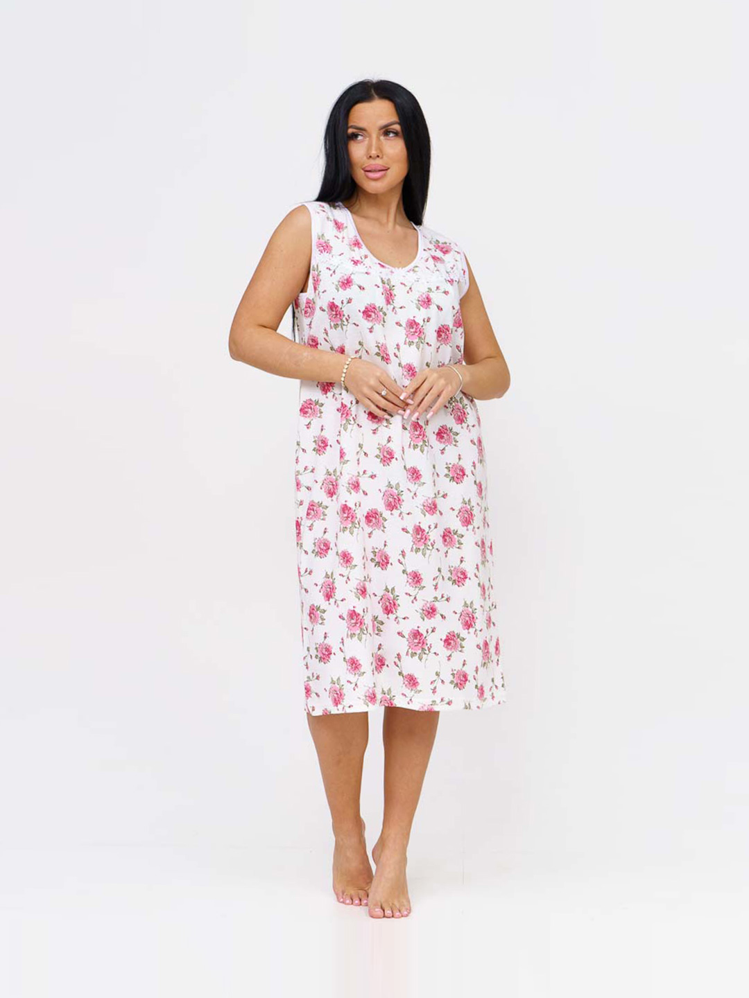 Ночная женская сорочка из хлопка, свободного силуэта, длиной ниже колена. Спереди кокетка отделанная шитьем, вырез горловины V-образный.