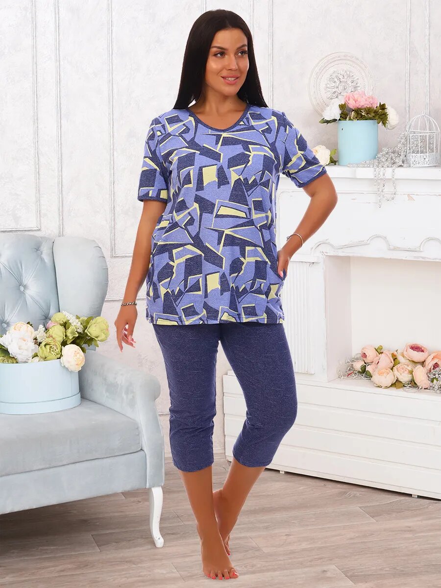 Костюм женский. Футболка с v-образным вырезом, втачным коротким рукавом и боковым карманом. Бриджи на резинке по линии талии.