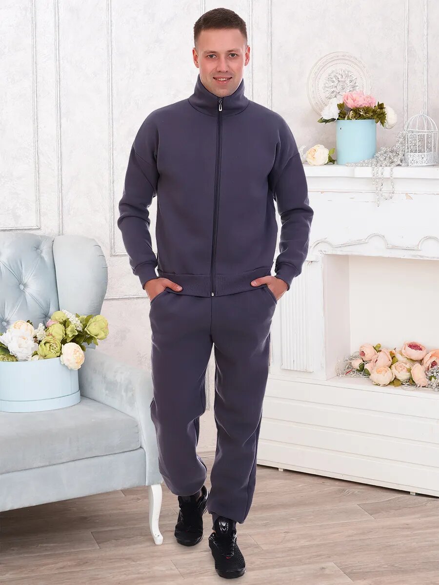 Костюм мужской из футера с начесом. Куртка с воротником-стойкой, боковыми карманами и разъемной молнией. Брюки на манжетах с боковыми карманами.