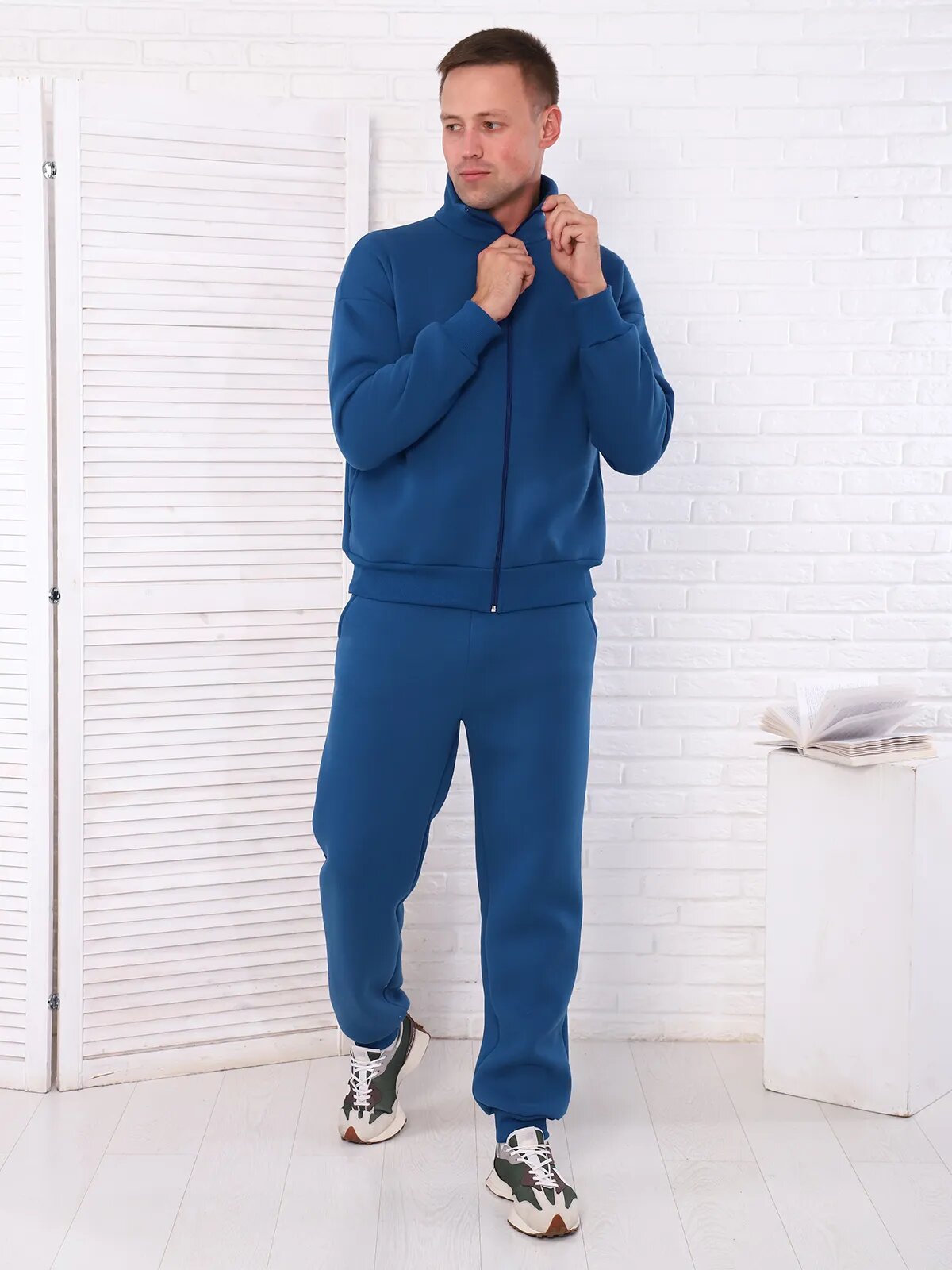Костюм мужской из футера с начесом. Куртка с воротником-стойкой, боковыми карманами и разъемной молнией. Брюки на манжетах с боковыми карманами.