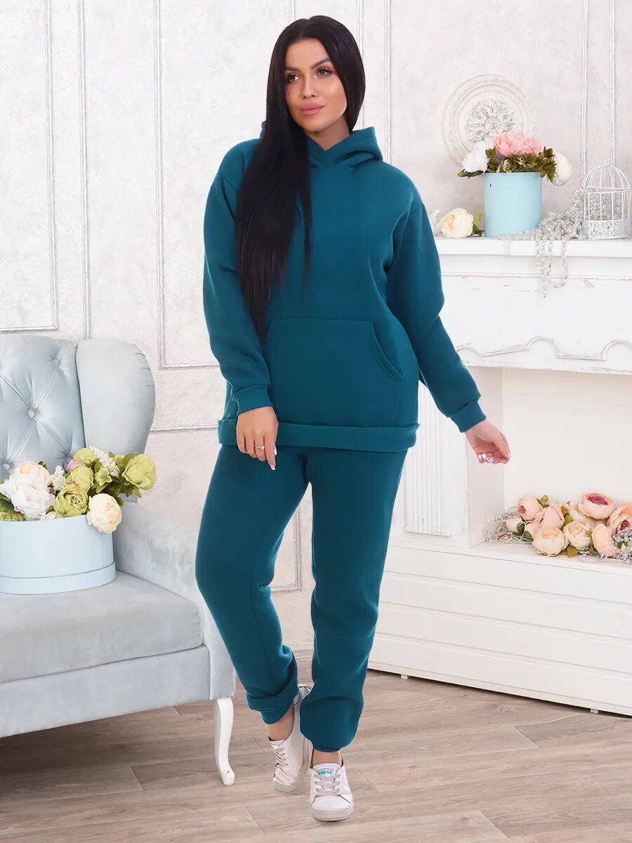 Костюм женский. Куртка со спущенным рукавом на манжете, двойным капюшоном и накладным карманом. Брюки на притачном поясе с резинкой, по низу изделия манжета. На передней части брюк - карманы.