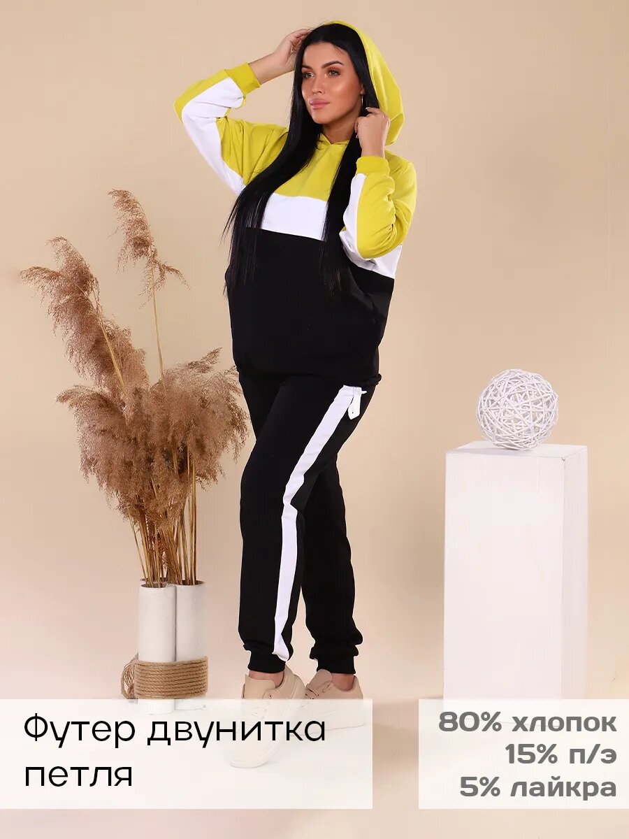 Костюм из футера в модных сочетаниях цветов. На куртке двойной капюшон, карман-кенгуру и кулиса со шнуром. Брюки с лампасами и карманами в боковых швах. Манжеты и пояс брюк из кашкорсе.