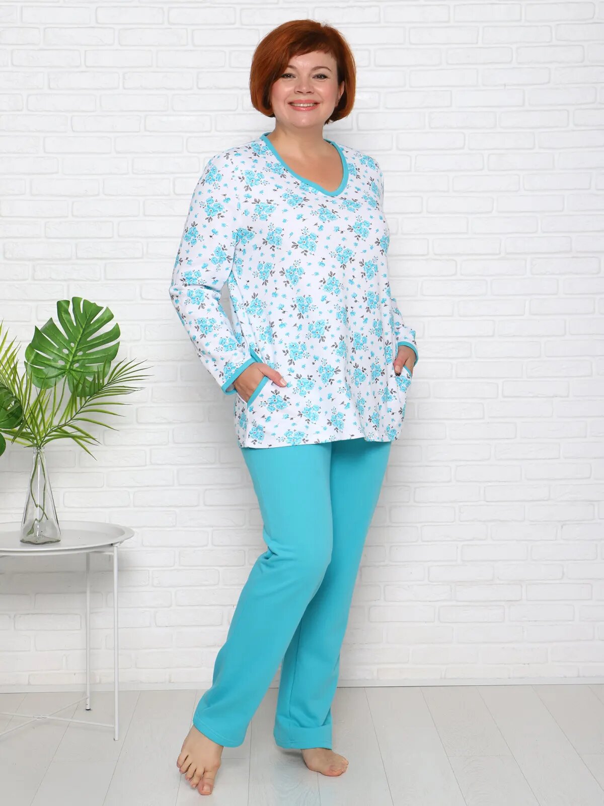Женский комплект из футера с начесом, состоящий из блузы с карманами и брюк. Срезы блузы окантованы полотном в цвет брюк. Верх брюк на резинке.